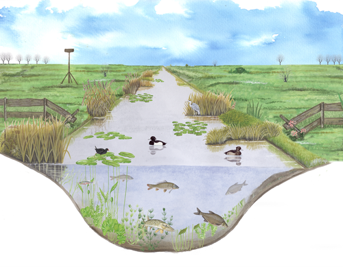 Bij het onderhoud aan de sloot is het belangrijk altijd een deel van de planten in en langs het water te laten staan. Zo is er altijd leefgebied voor verschillende soorten dieren en planten.