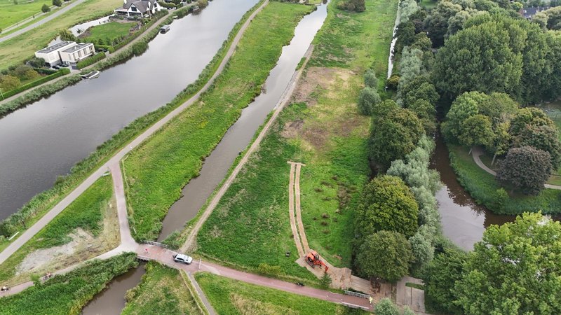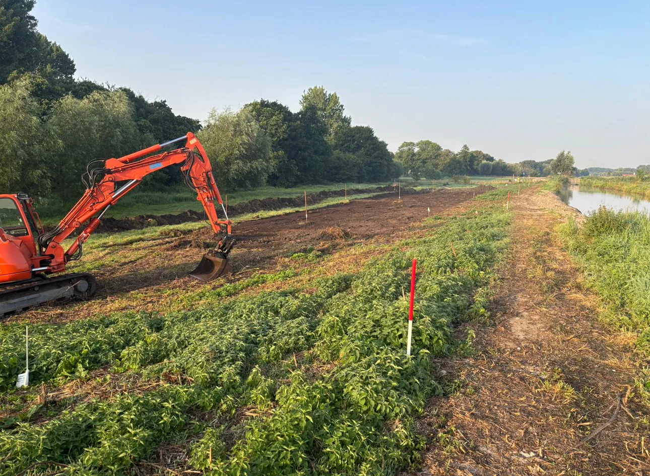 Op dit moment wordt het binnentalud -dat is de binnenzijde van de kade- van onder tot boven aangevuld met klei. Door het aanbrengen van deze berm wordt hij verder verstevigd. Deze werkzaamheden duren nog ongeveer een week. Daarna verhogen we de bovenkant van de kade.