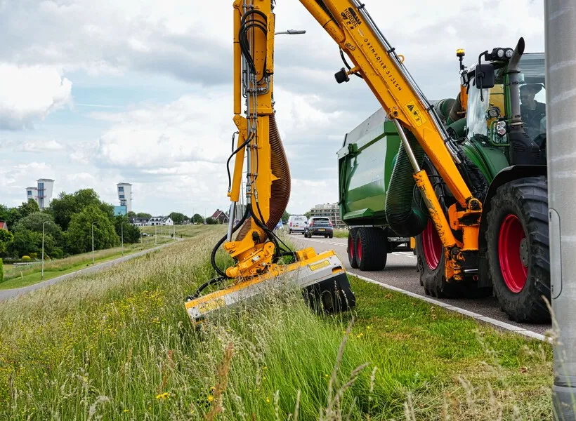 We zijn aan beide kanten van de Hollandsche IJssel bij Gouda begonnen met maaien. Rondom obstakels, zoals lantaarnpalen, verkeersborden en andere objecten maaien we vooraf al, zodat deze goed zichtbaar zijn voor de maaier op de tractor.