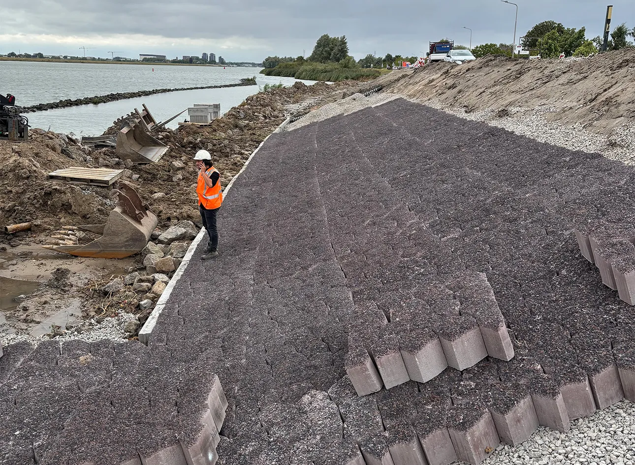 Langs de Schuwacht in Lekkerkerk worden de basaltstenen opnieuw geplaatst en aangevuld met stortsteen. Dan is de dijk weer sterk genoeg om het achterliggende te beschermen tegen het water uit de Lek.