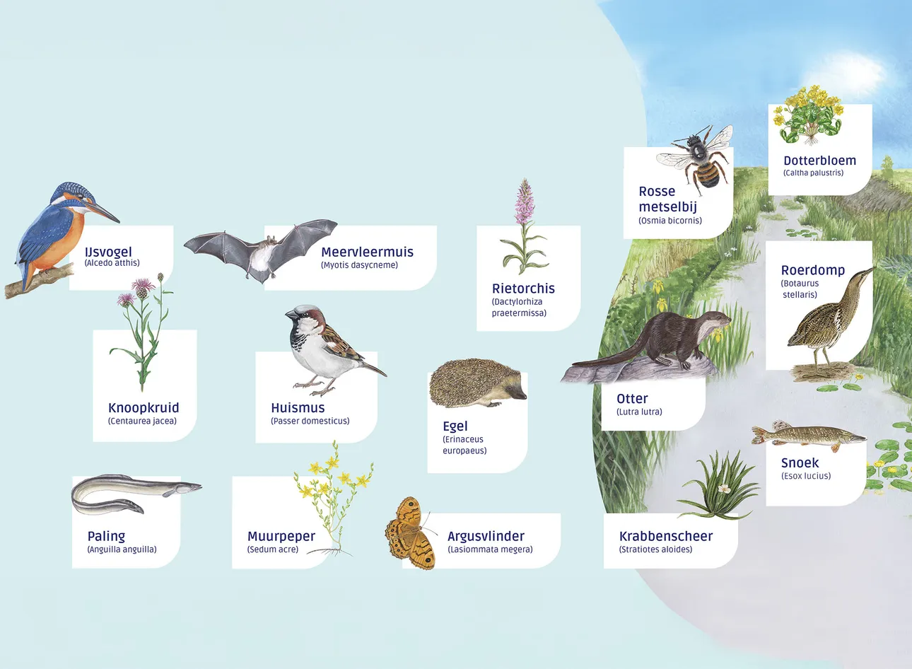 Als waterschap hebben we 15 soorten planten en dieren gekozen waar we als organisatie extra aandacht aan geven. Dit noemen we 'icoonsoorten', onze groene helden! Zij vertellen het verhaal over onze ambities, doelen en maatregelen om de biodiversiteit binnen ons werkgebied te behouden en te versterken.