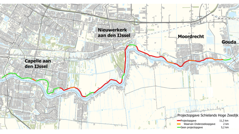 Op de kaart hieronder ziet u welke delen van de dijk onder de projectopgave vallen. De kaart laat de Schielands Hoge Zeedijk zien tussen Capelle aan den IJssel en Gouda. Langs de rivier loopt één lijn die het dijktraject volgt. Sommige delen van die lijn horen bij de projectopgave voor de dijkversterking. Andere delen horen daar niet bij en vormen onderbrekingen. Ook staan de plaatsen Capelle aan den IJssel, Nieuwerkerk aan den IJssel, Moordrecht en Gouda op de kaart zodat duidelijk is waar de projectdelen liggen.