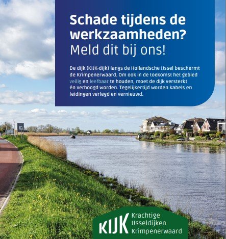 Bekijk het volledige Schadeprotocol werkzaamheden KIJK. Wilt u de schadeflyer ontvangen? Neem contact met ons op via het Omgevingsloket KIJK, dan sturen wij u deze alsnog toe.