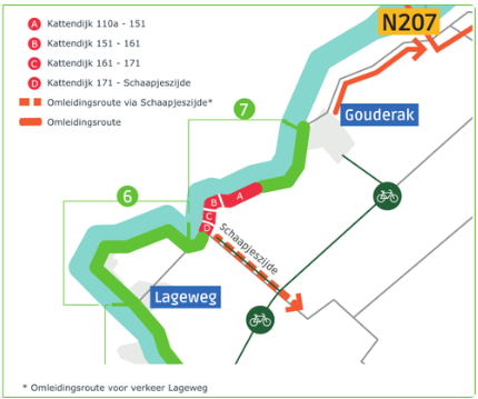 Na 17:00 uur, ’s nachts en in het weekend wordt er niet gewerkt. Er is één weghelft open voor verkeer. Verkeer kan dan alleen vanaf Gouderak naar Lageweg rijden. Het is niet mogelijk om vanaf Lageweg via de dijk naar Gouderak te gaan, ook niet met de fiets. Fietsers kunnen het beste omrijden via de Tiendwegen. Bekijk de omleidingsroutes op hhsk.nl/bereikbaarheid.