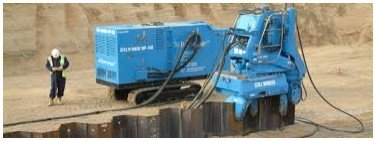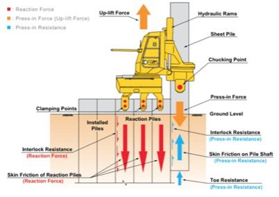 De drukmachine die bij de damwandproef gebruikt is heet ‘still worker’ en komt uit Groot-Brittannië. Dit is een merknaam. In Nederland wordt vaak gewerkt met een ‘silent piler’. (zie figuur 2) Beide apparaten doen hetzelfde, namelijk over de damwanden ‘lopen’ en de volgende plank erin drukken met een grote klem en hydraulische pers.