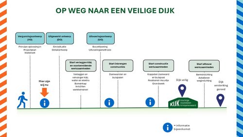 De dijkversterking is een moeilijk en groot project wat veel aandacht voor detail vraagt. De volledige planning is daarom nog niet bekend. De planning is en blijft maatwerk, mochten er gedeelten van de planning over een bepaalde tijdsperiode bekend zijn communiceren we dit op tijd naar de omwonenden. De werkzaamheden zijn eerder dit jaar gestart. We werken richting Gouderak en beginnen in de bocht bij voetbalvereniging VVV Gouderak (dijkvakken 8/Q/RS). De werkvolgorde is als volgt: