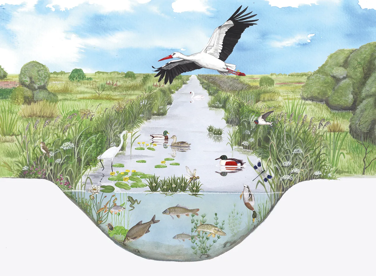 Icoonsoorten: rietorchis, dotterbloem, krabbenscheer, roerdomp, ijsvogel, meervleermuis, otter, snoek, paling.