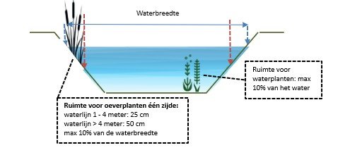 - Maximale begroeiing met oeverplanten: 10% van de waterbreedte