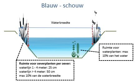 Oeverplanten van sloten breder dan 4 meter: Minimaal 50 centimeter brede rand, Maximaal 10% van de waterbreedte.