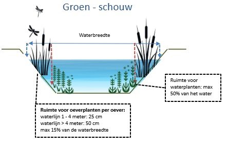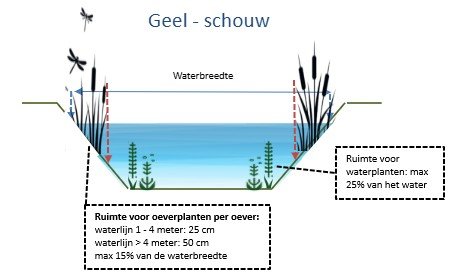 Oeverplanten van sloten breder dan 4 meter: Minimaal 50 centimeter brede rand, Maximaal 15% van de waterbreedte.