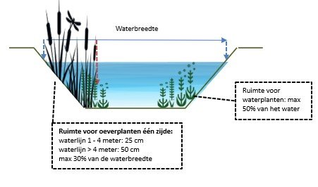 - Maximale begroeiing met oeverplanten: 15% van de breedte