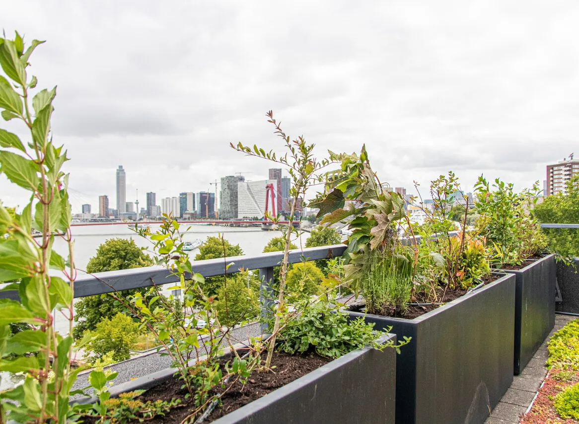 In totaal zijn vier dakvlakken met een oppervlakte van 542 m2 bedekt door verschillende soorten sedum, grassen, kruiden en andere lage beplanting. Daarmee kan het dak ruim 23.000 liter water (150 badkuipen!) vasthouden. Op ons dak en op het balkon van ons pand zijn plantenbakken geplaatst. Dit zorgt voor zo’n 30 m2 aan extra groen. De bedoeling is dat de planten in deze bakken langs de gevel naar beneden groeien.