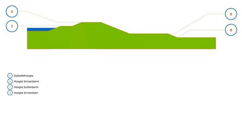Het profiel van de waterkering wordt beschreven door de dijktafelhoogte, de kruinlijnen en de teenlijnen. De teenlijn ligt 5 meter binnen de grens van de kernzone. Van eventueel aanwezige bermen is de ligging en hoogte aangegeven. De kruinlijnen, bermen en teenlijnen beschrijven de waterkering zoals die daadwerkelijk aanwezig is.