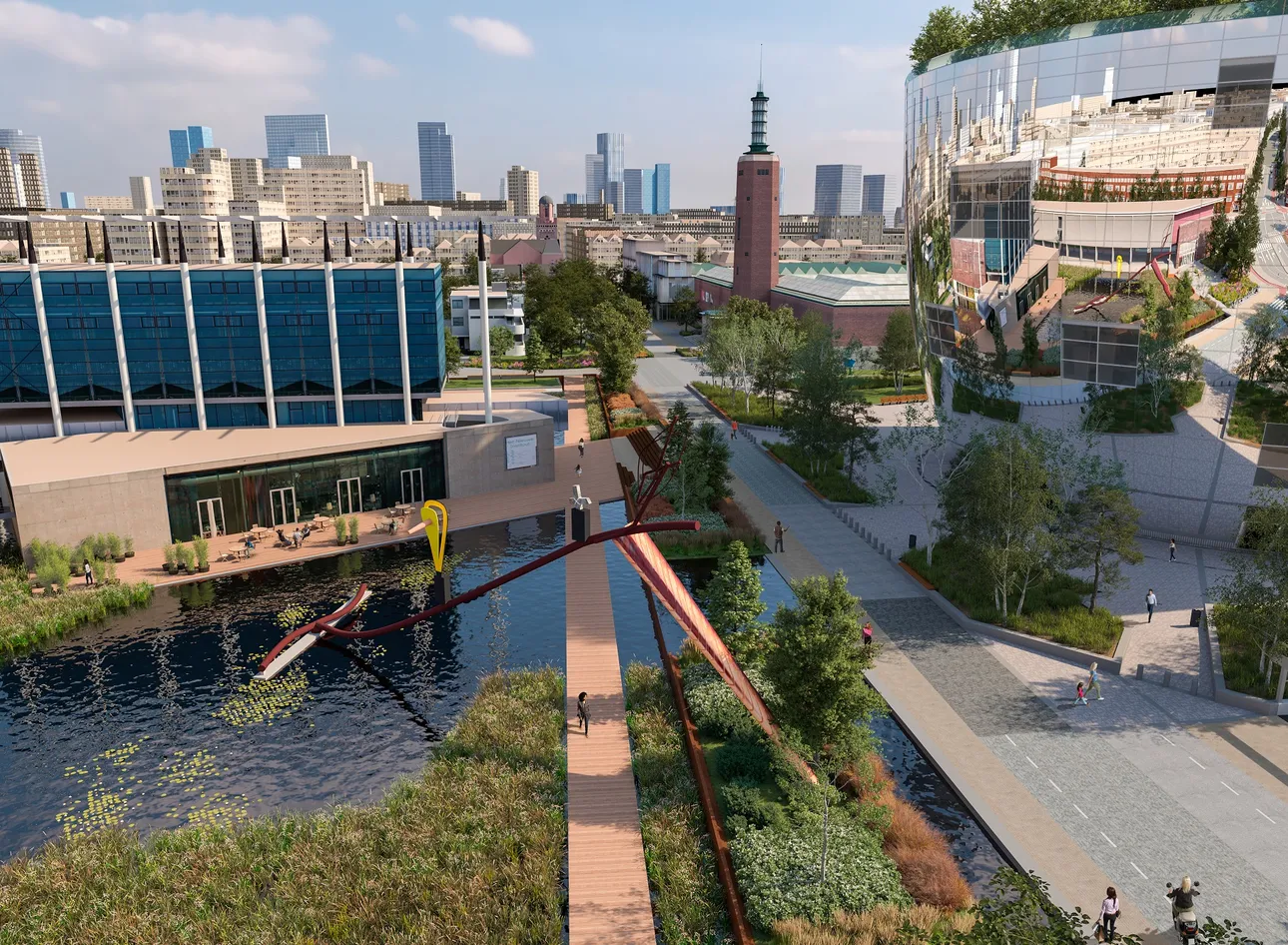 De urban waterbuffer is een bijzonder ondergronds wateropvangsysteem. Bij regenval stroomt het overtollige regenwater uit de omgeving van het Museumpark via een apart regenwaterriool naar de vijvers voor Het Nieuwe Instituut. Zodra het waterpeil van de vijvers te hoog komt, wordt het overschot aan water automatisch weggepompt naar een zandlaag in de bodem. In deze zandlaag ontstaat een ‘waterbel’. Als het waterpeil in de vijvers daalt, wordt het water uit de waterbel weer naar boven gepompt.