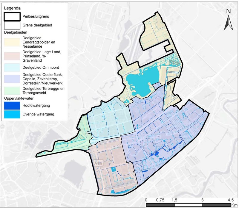 Het peilbesluitgebied is langs de Rotte en langs de Ringvaart Prins Alexanderpolder en Ringvaart Zuidplaspolder begrensd door regionale keringen (boezemkaden). Langs een deel van de Rotte is een getrapt systeem aanwezig met parallel aan de boezemkade een tussenboezemkade (of Ringkade). Deze tussenboezems hebben naast een aanvoerfunctie ook een functie om de freatische lijn in de Rottekade op peil te houden.