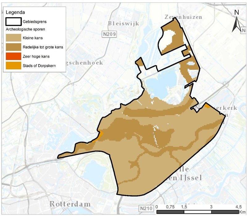 In het gebied bevinden zich een aantal archeologische sporen. Ter hoogte van Terbregge en Nieuwerkerk aan den IJssel bevinden zich oude Stads of Dorpskernen. Er is een kleine tot redelijk grote kans dat er archeologische sporen gevonden worden in de ondergrond, zie Figuur 2.