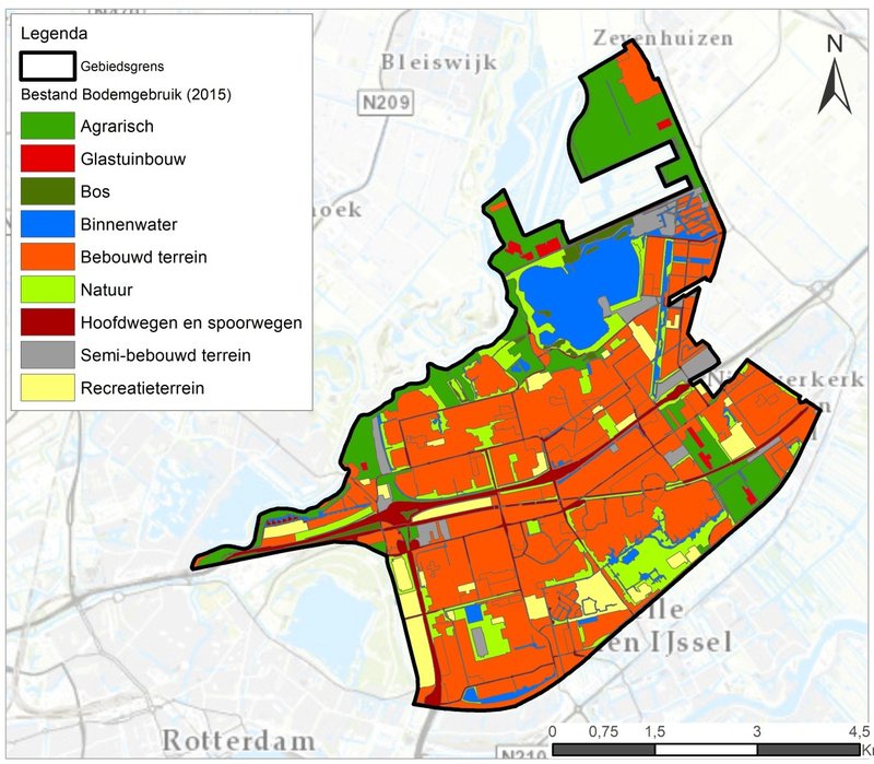 Polder Prins Alexander bestaat voor het grootste deel uit stedelijk gebied. Er vindt weinig landbouw plaats. Het agrarisch gebied bevindt zich voornamelijk aan de noordkant van het gebied, terwijl de glastuinbouw meer over het gebied heen verspreid is. Daarnaast zijn nog een aantal afwijkende vormen van landgebruik te onderscheiden. Dit betreft begraafplaatsen, sportvelden, stadsparken en volkstuincomplexen. Deze zijn als semi-bebouwd gebied op de kaart te zien (zie Figuur 3).