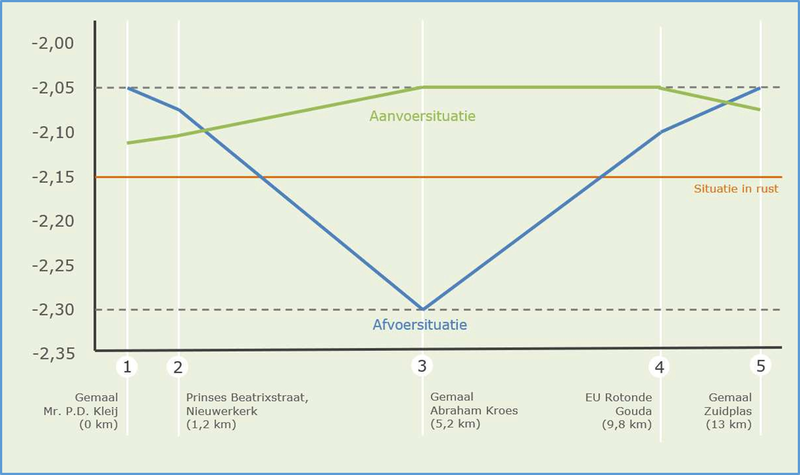 Het peil op de Ringvaart in rust (geen watertransport) is gelijk aan het streefpeil.