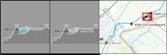 Figuur 7. Maximaal (links) en minimaal (midden) waterpeil (m NAP) op het traject Nieuwerkerk aan den IJssel-Moordrecht (rechts) bij droogte (links) en bij neerslag (midden).
