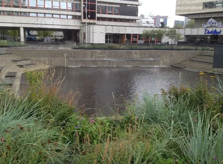 Als het heel erg hard regent, wordt het water opgevangen op en onder het plein. Een verdiept sportgedeelte loopt pas bij hevige regenbuien onder water en functioneert dan als extra opbergruimte. Zodra het weer droog is, wordt het water afgevoerd en vallen deze delen droog. Daardoor is er weer volop ruimte om op de traptribune te relaxen of in het verdiepte deel te sporten.